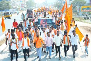స్వేచ్ఛ న్యూస్, ఫిబ్రవరి 19, నార్కెట్పల్లి: మరాఠా యోధుడు చత్రపతి శివాజీ మహారాజ్ హిందూ సమాజానికి చేసిన సేవలు అనిర్వచనీయమైనవని అతని దృఢ సంకల్పంతో నేటి హిందూ సమాజం నిలబడగలిగిందని నాడు శివాజీ లాంటి నాయకుడు లేకుంటే భారతదేశం పూర్తిగా ఇతర మతస్తుల కబంధహస్తాలలో నలిగిపోయేదని పలువురు వక్తలు పేర్కొన్నారు. బుధవారం చత్రపతి శివాజీ మహారాజ్ జయంతి సందర్భంగా నార్కెట్పల్లి మండల కేంద్రంలో హిందూ వాహిని ఆధ్వర్యంలో నిర్వహించిన ర్యాలీ లో పట్టణంతోపాటు మండలంలోని వివిధ గ్రామాలకు చెందిన యువత పాల్గొని తమ హృదయ సామ్రాట్ శివాజీ మహారాజ్ గొప్పతనాన్ని కీర్తిస్తూ నినాదాలు చేస్తూ మండల కేంద్రంలోని మునుగోడు చౌరస్తా నుంచి అమ్మనబోలు చౌరస్తా వరకు ర్యాలీ నిర్వహించారు. ఈ సందర్భంగా మరాఠా యోధుడు శివాజీ హిందూ సమాజానికి చేసిన గొప్ప సేవలను కీర్తిస్తూ తన కుమారుడు శంభాజీ మహారాజుని ఔరంగజేబు పెట్టిన చిత్రహింసలను గుర్తుచేసుకొని వారి చిత్రహింసలకు నెరవకుండా మతం మారడానికి నిరాకరించి మత మార్పిడికి అడ్డుకట్ట వేసిన మొదటి గురువుగా సంభాజిని కీర్తిస్తూ యువకులు తన్మయత్వంతో ఊగిపోయారు. శివాజీ మహారాజ్ చేసిన సేవలు తరతరాలపాటు హిందూ యువతను మేల్కొల్పే విధంగా ఉంటాయని శివాజీని ఆదర్శంగా తీసుకొని నేటి యువత హిందూ సంస్కృతి సాంప్రదాయాలను కాపాడుతూ ధర్మరక్షణకు కంకణబద్ధులై తమ కర్తవ్యాన్ని నెరవేర్చాలన్నారు. ప్రాచీన కాలంలో ఇతర దేశాల నుంచి వలస వచ్చిన నాయకులు ఎన్ని చిత్రహింసలు పెట్టినా ఎలాంటి భయం, బెరుకు లేకుండా పాశ్చాత్తుల గుండెల్లో గుణపాలు దించిన శివాజీని తమ దేశ దైవంగా భావించి స్తుతించారు. ఈ కార్యక్రమంలో నిర్వాహకులు హిందూ వాహిని రాజు, బిజెపి నాయకులు పజ్జురు వెంకటరెడ్డి, మేడ బోయిన శ్రీనివాస్ యాదవ్, నోముల నాగరాజు, మునుకుంట్ల గణేష్, పుల్లెంల మహేష్, అనంతుల నాగరాజు, నల్లగొండ నాగరాజు, భాశెట్టి ప్రవీణ్, వడ్డేగోని రామలింగం, పాలకూరి రమేష్, శివ, బైరోజు ఉపేంద్ర చారి, ప్రవీణ్, పార్ధు, శేఖర్, రావుల తిరుమలేష్, అంజి, శివ తదితరులు పాల్గొన్నారు.
